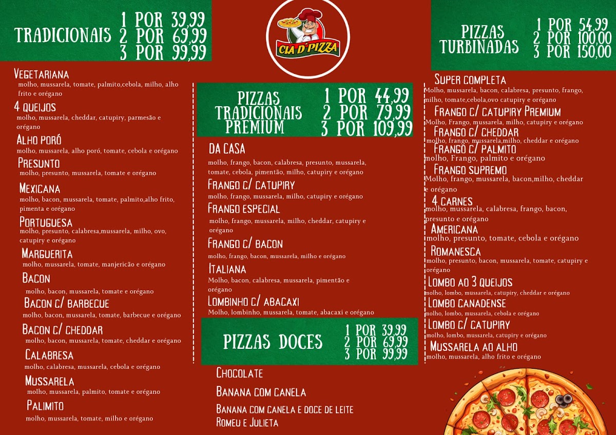 The menu at Cia D' Pizza Delivery offers a delightful range of pizzas, featuring both savory and sweet options. For those with a sweet tooth, the Pizzas Doces stand out with tempting choices like Da Casa, Frango Catupiry, Frango Especial, and Frango com Bacon, each offering unique toppings and flavors. Along with these options, traditional favorites such as Presunto (ham) make an appearance, promising a well-rounded pizza experience. The variety ensures that there’s something for everyone, whether you crave a rich, creamy combination or a savory classic. Prices for each dish may vary, but the range caters to different tastes and preferences, offering both satisfying and affordable options.